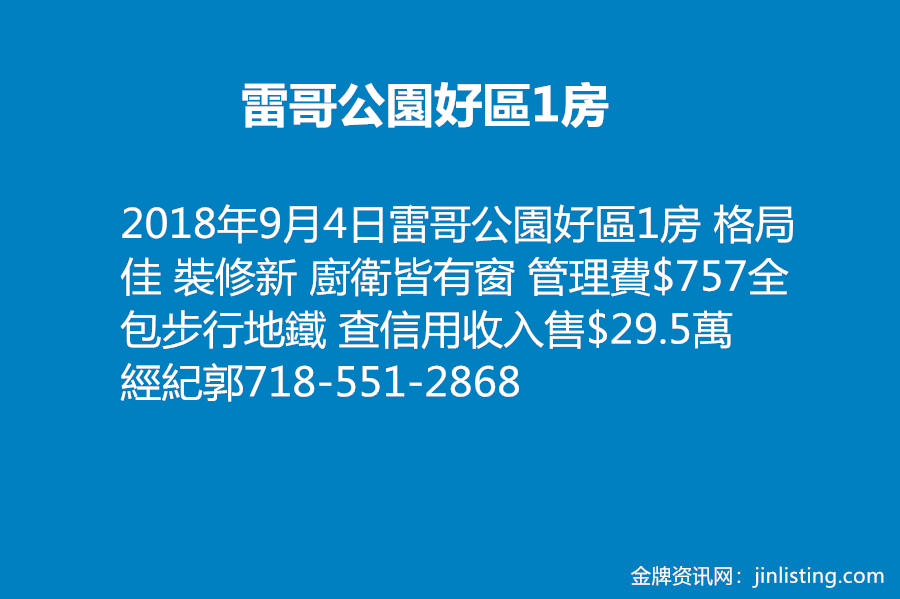 時間 : 週六、日 1-3pm 地址: 99-60 63 Rd Rego Park NY 11374 雷哥公園好區, 1房, 格局佳, 裝修新, 廚衛皆有窗, 管理費$757全包 24小時門衛, 步行地鐵, 查信用 收入, 售$29.5萬 請預約 經紀 郭 718-551-2868