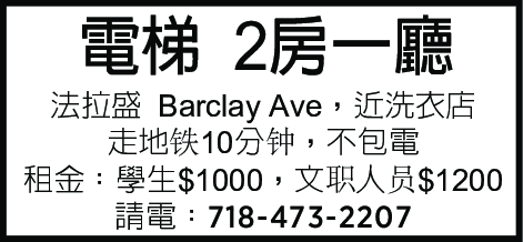 法拉盛 Barclay Ave,近洗衣店,走地铁10分钟,租金:学生$1000,文职人员$1200,不包電。718-473-2207