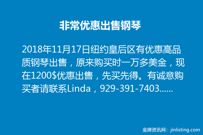 非常优惠出售钢琴 纽约皇后区有优惠高品质钢琴出售,原来购买时一万多美金,现在1200$优惠出售,先买先得。有诚意购买者请联系Linda,929-391-7403,微信:Lindawell898