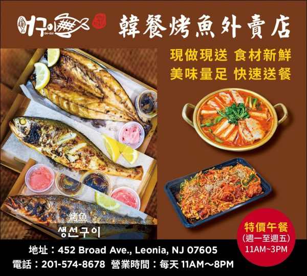 烤魚(Oh-Gui)是位於新澤西州里奧尼亞的韓式烤魚專業外賣餐廳,有鯖魚、鰺魚、林延水等各種烤魚便當和豬肉蓋飯等,其特點是用新鮮材料點餐後立即烹飪。 提供打包和配送服務(Uber Eats等),還有午餐特價。