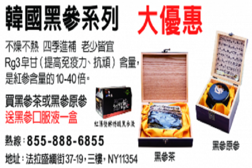 韓國黑參系列大優惠 不燥不熱 四季進補 老少皆宜 Rg3皁甘(提高免疫力、抗頑)含量,是紅參含量的10-40倍。 買黑參茶或黑參原參 送黑參口服液一盒 熱線:855-888-6855 地址:法拉盛緬街37-19,三樓,NY11354