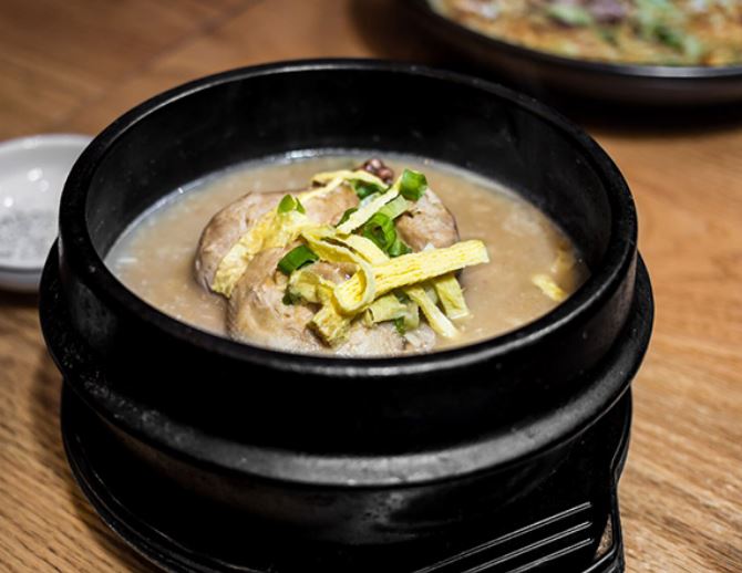 店里的参鸡汤(Samgyetang)远近闻名。鸡汤是由很多童子鸡一同熬制,鸡汤非常鲜浓。而且把糯米、大枣、栗子等放入鸡的里面,吃鸡的时候让人惊喜不已。鸡汤里面还有高丽参等名贵的补品,美味又滋补,真是恢复体力,强身健体的上选。
