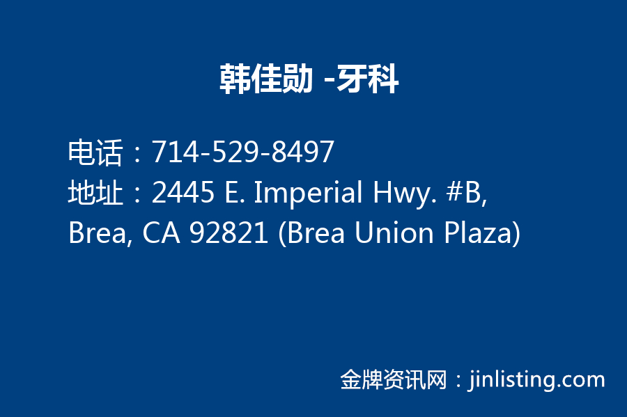 韩佳勋医师来自台湾,幼年赴美,1988年以全校最高荣誉生O.K.U.毕业于伊利诺州立大学,韩医师即任职于南加州美国空军基地,担任驻院主任医师多年,接受国家严格的专科及技术训练,曾任教于UCLA南加大学院的牙医特聘教授(Faculty)。韩医师医术精湛,有崇高的医德,美国国防部并于89年至92年间,连续四年颁发美国空军最高医术医德奖给韩医师。1991年被全加州各空军基地甄选为全国的加州军医代表,去首府华盛顿D.C.接受最高医术医德奖。韩医师累积了十六年丰富临床经验,在华人颇密集的东区及橙县交接处开业,诊所内特别注重卫生及消毒,做到军医院严格消毒标准外,并使用一次即丢的牙医设备。韩医师严守医德,尽量考虑到消费者的利益和花费,加上他的服务态度亲切热表,故在华人社区深受好评。