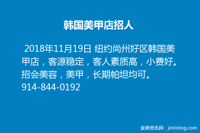 韩国美甲店招人 纽约尚州好区韩国美甲店,客源稳定,客人素质高,小费好。招会美容,美甲,长期帕坦均可。914-844-0192