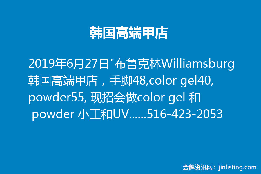 “布鲁克林Williamsburg 韩国高端甲店,手脚48,color gel40, powder55, 现招会做color gel 和 powder 小工和UV gel大工 联系电话 516-423-2053 如电话未接 可短信联系(老板说英语和韩文)”