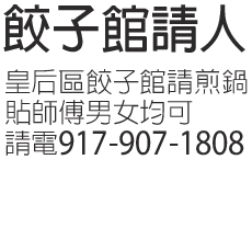 皇后區,餃子館,請煎鍋貼師傅,男女均可,有意請電: 917 -907-1808