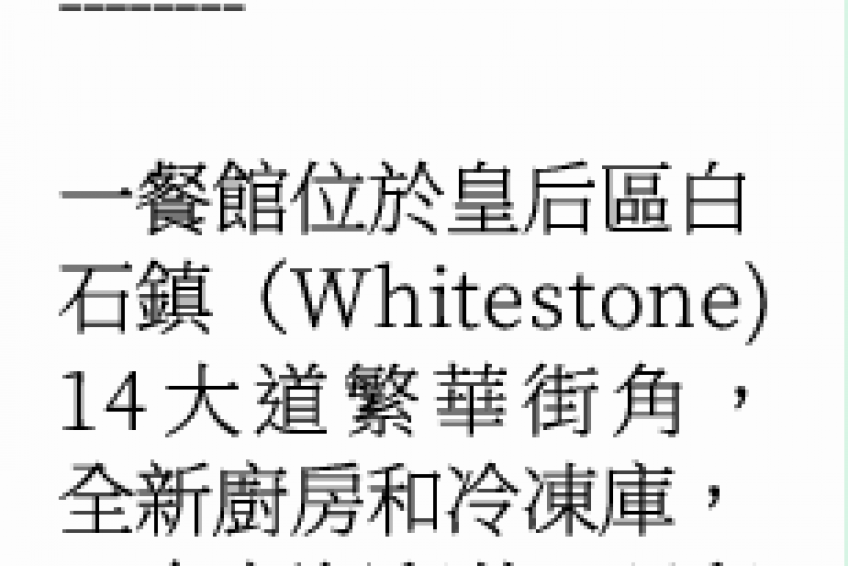一餐館位於皇后區白石鎮(Whitestone) 14大道繁華街角,全新廚房和冷凍庫,13年超級租約,月租僅3K,