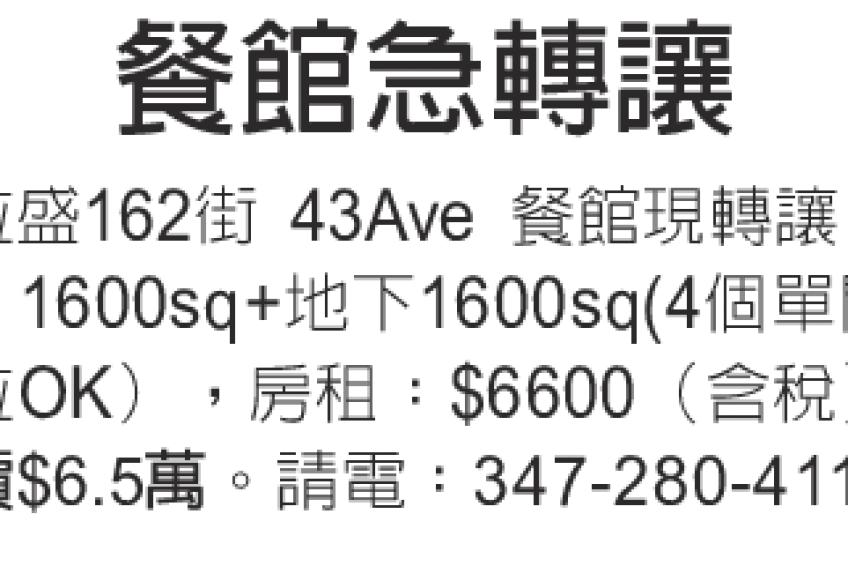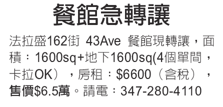 面積:1600sq+地下1600sq(4個單間,卡拉OK),房租:$6600(含稅),售價:6.5萬