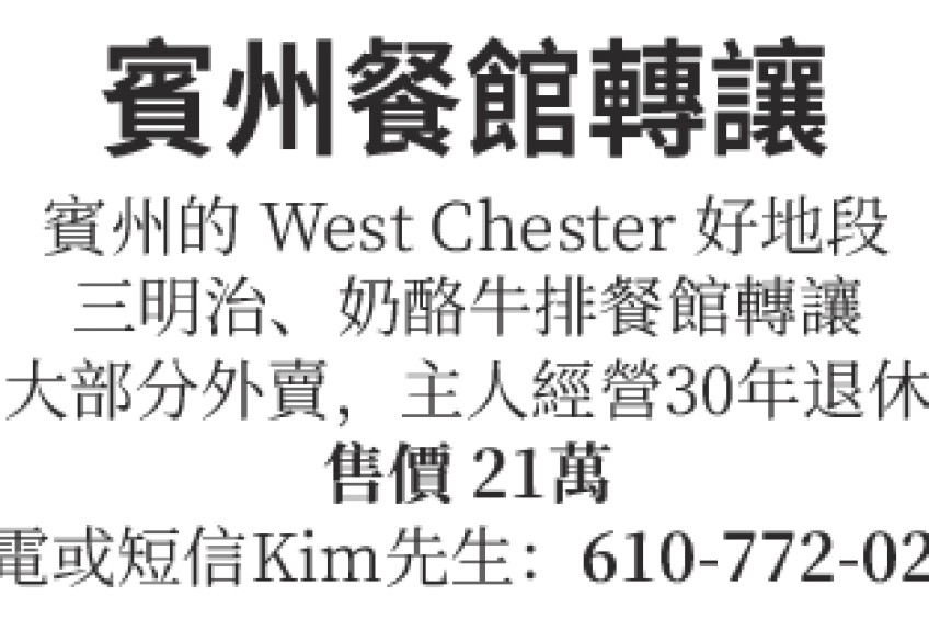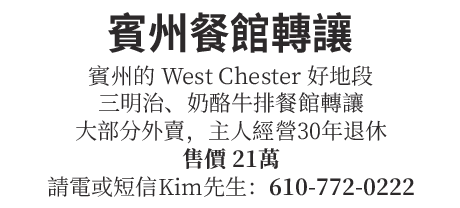 位於賓州的West Chester好地段的三明治,奶酪牛排餐館(大部分外賣)轉讓,主人經營30年退休,價格$21萬,請電或短信Kim先生610-772-0222