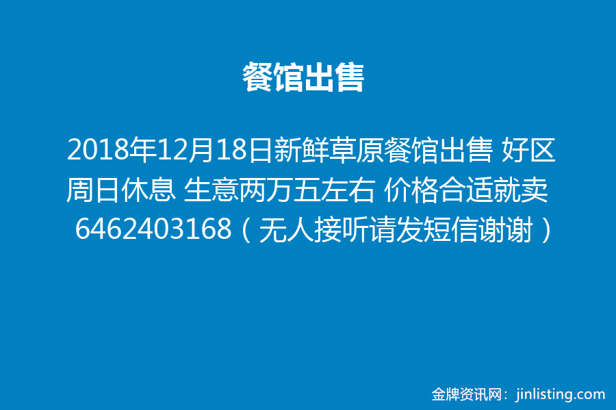 餐馆出售 新鲜草原餐馆出售 好区 周日休息 生意两万五左右 价格合适就卖 6462403168(无人接听请发短信谢谢)