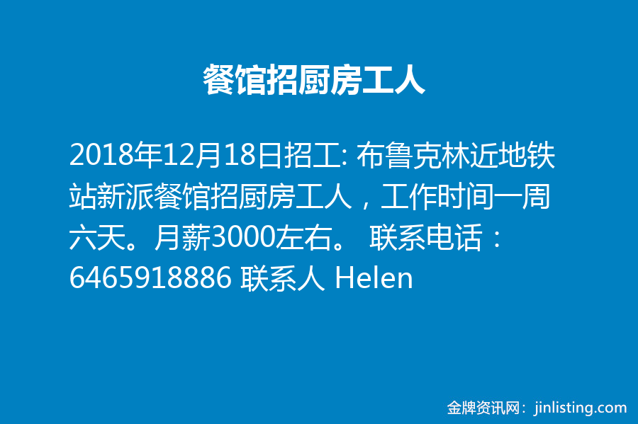 招工: 布鲁克林近地铁站新派餐馆招厨房工人,工作时间一周六天。月薪3000左右。 联系电话:6465918886 联系人 Helen