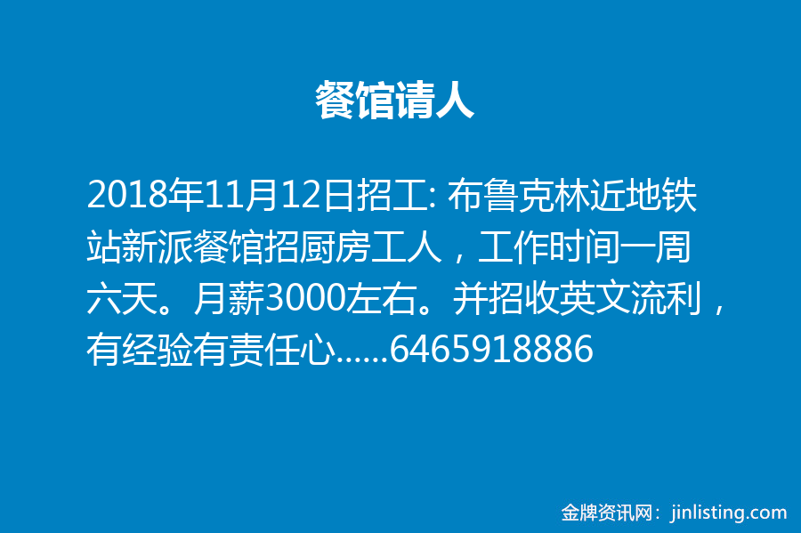 餐馆请人 “招工: 布鲁克林近地铁站新派餐馆招厨房工人,工作时间一周六天。月薪3000左右。并招收英文流利,有经验有责任心的收银员(工作时间和工资电聊) 联系电话:6465918886 联系人 Helen 联系地址 Brooklyn downtown”