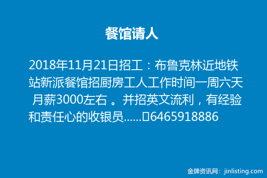 餐馆请人 “招工:布鲁克林近地铁站新派餐馆招厨房工人工作时间一周六天 月薪3000左右 。并招英文流利,有经验和责任心的收银员(工作时间和工资电聊)联系电话6465918886 联系人 Helen”