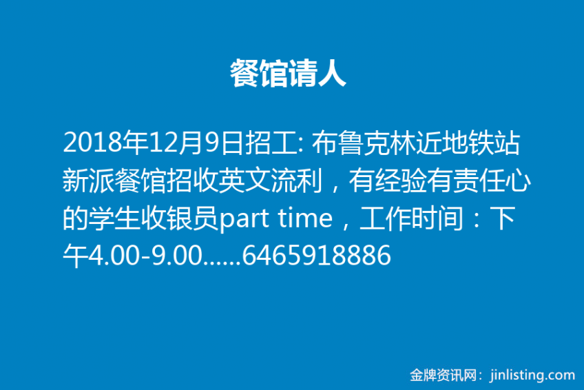 餐馆请人 “招工: 布鲁克林近地铁站新派餐馆招收英文流利,有经验有责任心的学生收银员part time,工作时间:下午4.00-9.00,以及周末全天 联系电话:6465918886 联系人 Helen”