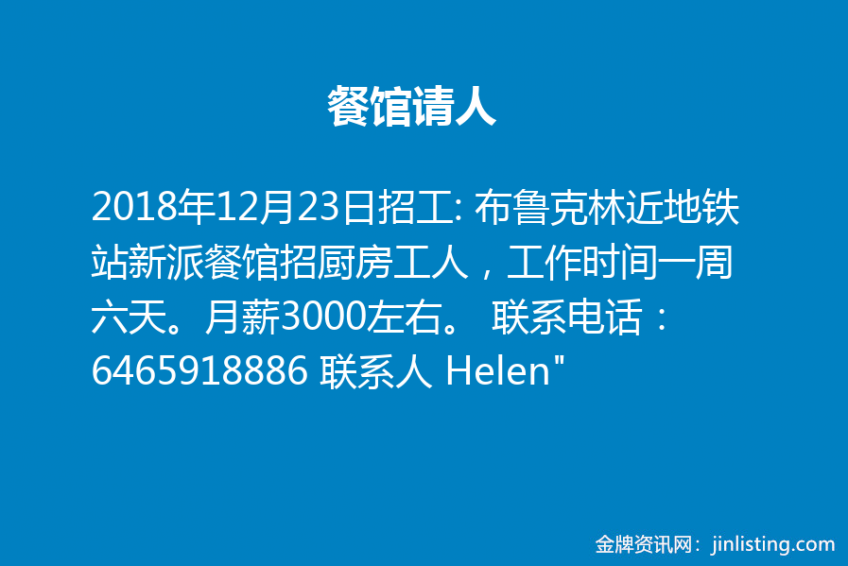 餐馆请人 “招工: 布鲁克林近地铁站新派餐馆招厨房工人,工作时间一周六天。月薪3000左右。 联系电话:6465918886 联系人 Helen”