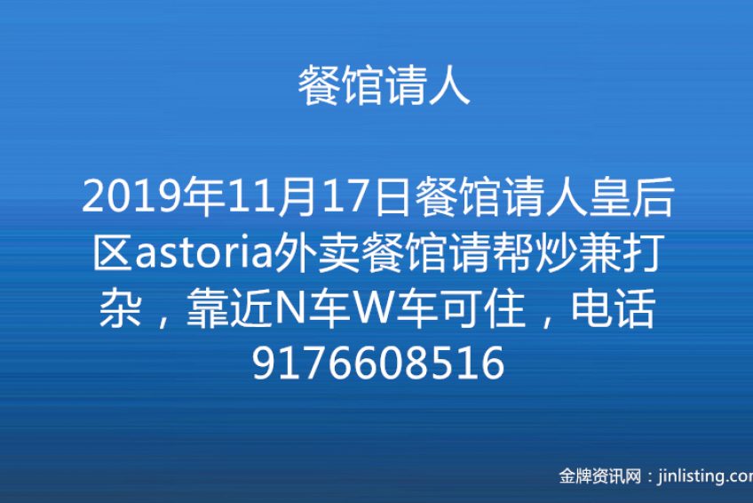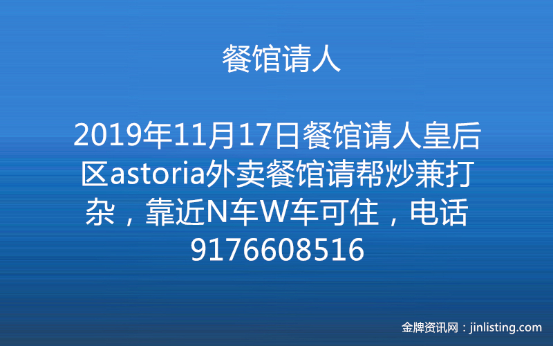 餐馆请人 皇后区astoria外卖餐馆请帮炒兼打杂,靠近N车W车可住,电话9176608516