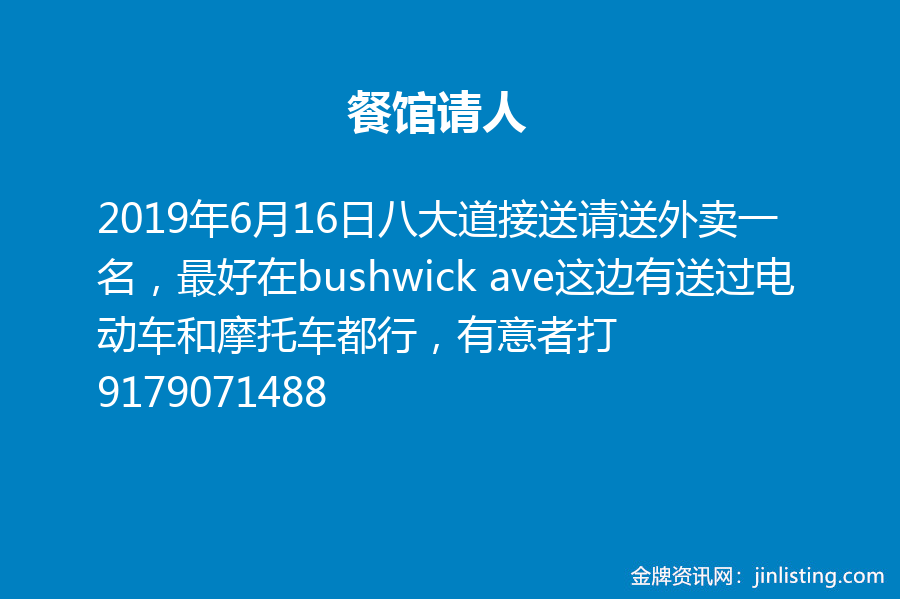 餐馆请人 八大道接送请送外卖一名,最好在bushwick ave这边有送过电动车和摩托车都行,有意者打9179071488