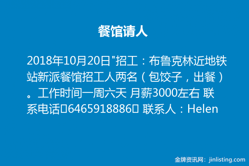 餐馆请人 “招工:布鲁克林近地铁站新派餐馆招工人两名(包饺子,出餐)。工作时间一周六天 月薪3000左右 联系电话6465918886 联系人:Helen 地址:Brooklyn downtown”
