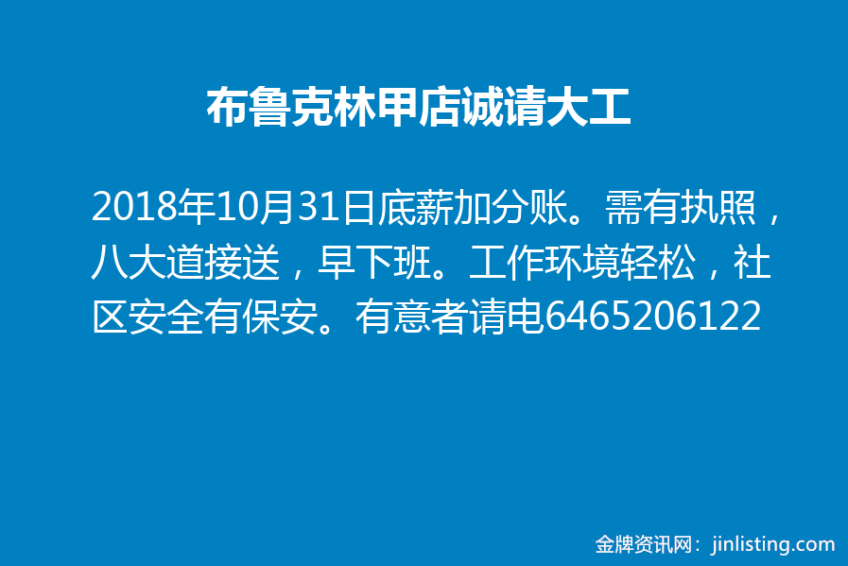 餐馆请人 “招工: 布鲁克林近地铁站新派餐馆招厨房工人,工作时间一周六天。月薪3000左右。并招收英文流利,有经验有责任心的收银员(工作时间和工资电聊) 联系电话:6465918886 联系人 Helen 联系地址 Brooklyn downtown”