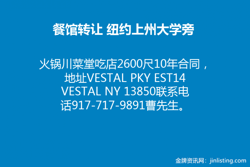 餐馆转让 纽约上州大学旁,火锅川菜堂吃店2600尺10年合同,因股东不合因此转让有意者看店地址VESTAL PKY EST14 VESTAL NY 13850联系电话917-717-9891曹先生。