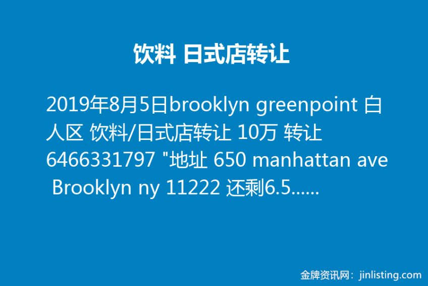 brooklyn greenpoint 白人区 饮料/日式店转让 10万 转让 6466331797 “地址 650 manhattan ave Brooklyn ny 11222 还剩6.5 年租约 加 5年options 店里设备 机器 都是新的 本人急回国 便宜转让 请电话细谈 6466331797”
