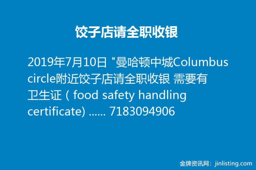 “曼哈顿中城Columbus circle附近饺子店请全职收银 需要有 卫生证(food safety handling certificate) 工作简单,交通方便,包吃,高薪. 请电 7183094906 *我不需要警钟,拒绝广告电话”