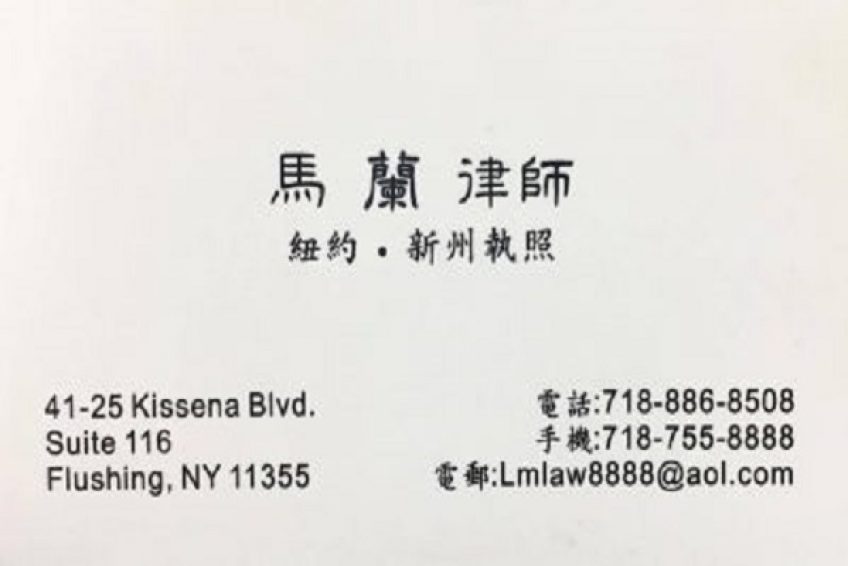 馬蘭律師 紐約.新州執照 41一25 Kissena Blvd. Suite 116 Flushing, NY 11355 電話:718-886-8508 手機:718-755-8888 電郵:Lmlaw8888@aol.com