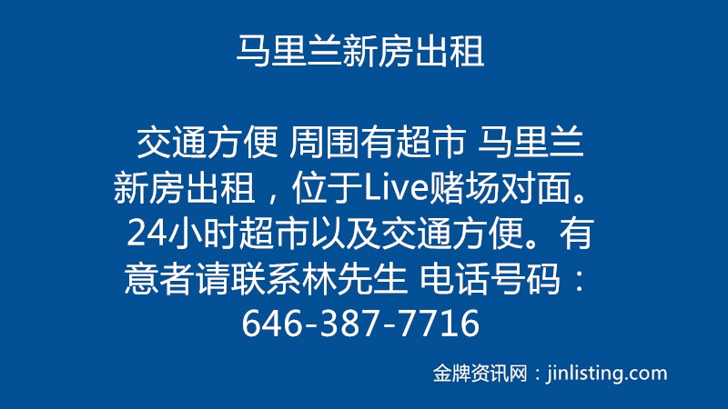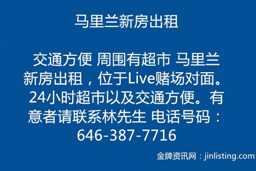 马里兰新房出租 交通方便 周围有超市 马里兰新房出租,位于Live赌场对面。24小时超市以及交通方便。 有意者请联系林先生 电话号码:646-387-7716