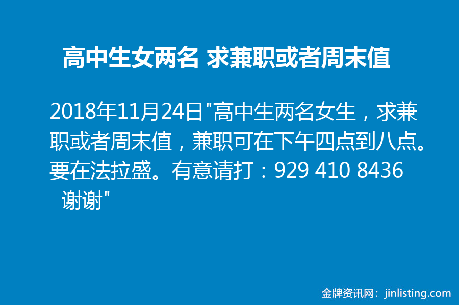 “高中生两名女生,求兼职或者周末值,兼职可在下午四点到八点。要在法拉盛。