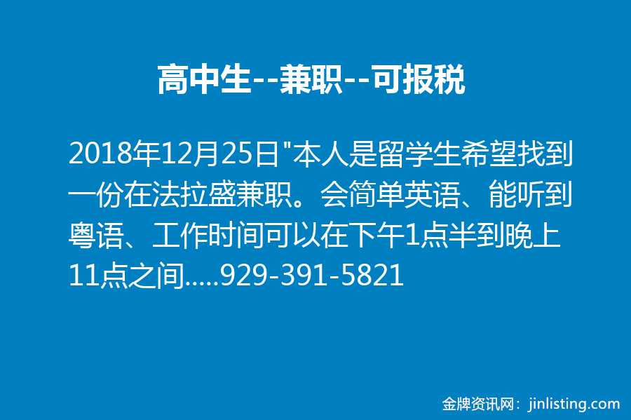 高中生–兼职–可报税 929-391-5821