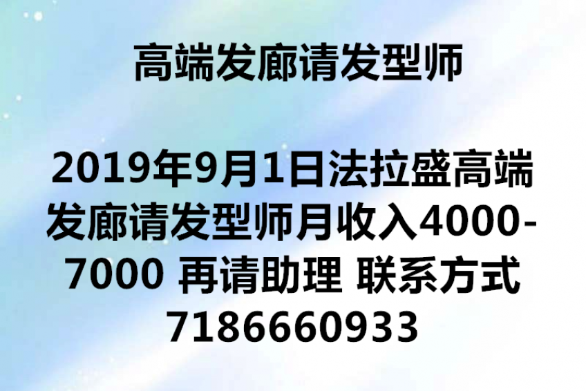法拉盛高端发廊请发型师月收入4000-7000 再请助理 联系方式7186660933