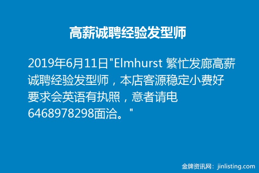 “Elmhurst 繁忙发廊高薪诚聘经验发型师,本店客源稳定小费好 要求会英语有执照,意者请电6468978298面洽。”