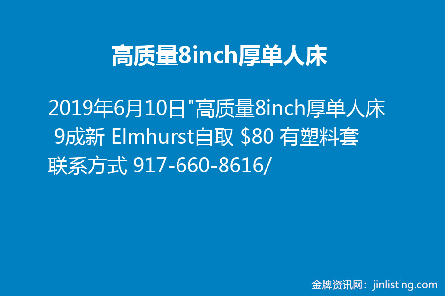 “高质量8inch厚单人床 9成新 Elmhurst自取 $80 有塑料套 联系方式 917-660-8616/