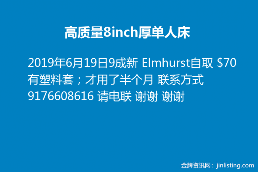 “高质量8inch厚单人床 9成新 Elmhurst自取 $70 有塑料套;才用了半个月 联系方式 9176608616 请电联 谢谢 谢谢”