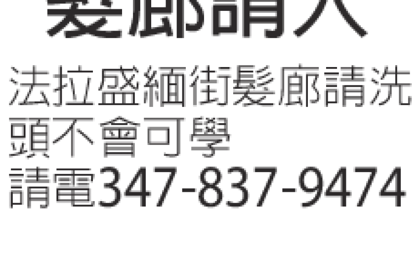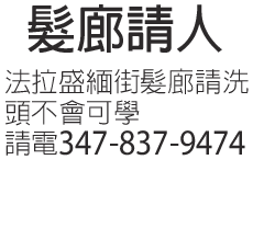 髮廊請人.法拉盛緬街髮廊請洗頭,不會可學.3478379474