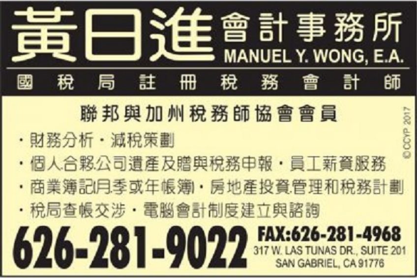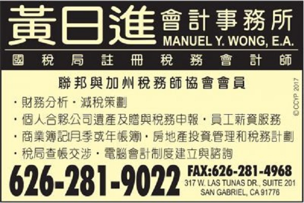 黄日進会计师还帮助新住民,以及台湾想要到美国开 展新的事业版图的公司,家庭,及个人提供优良国际税法服务。 高学历的优势加之丰富的专业实践经验,将是您生意成功的有利助手。无论是 公司、商号、合伙经营、家庭或个人都离不开会计和税务,而黄日進会计事务 所将是您明智的选择。