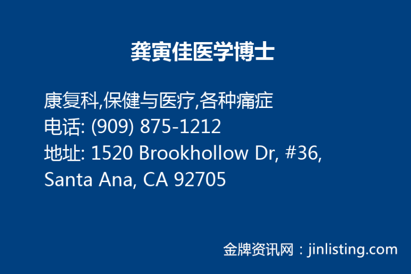 龔寅佳醫生是加利福尼亞(California)康復科和疼痛管理執照醫師,在上海同濟大學醫學院取得醫學學位。曾在VA大洛杉磯醫療系統洛杉磯完成住院醫訓練。龔寅佳醫生所在的醫療機構是AccCare Medical Group,龔寅佳醫生擅長於疼痛管理
