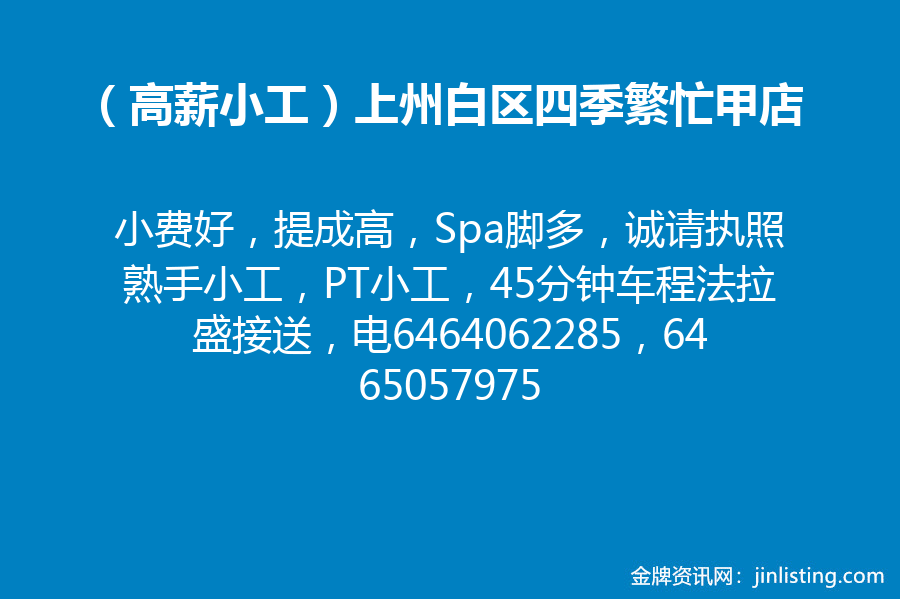 (高薪小工)上州白区四季繁忙甲店小费好,提成高,Spa脚多,诚请执照熟手小工,PT小工,45分钟车程法拉盛接送,电6464062285,6465057975