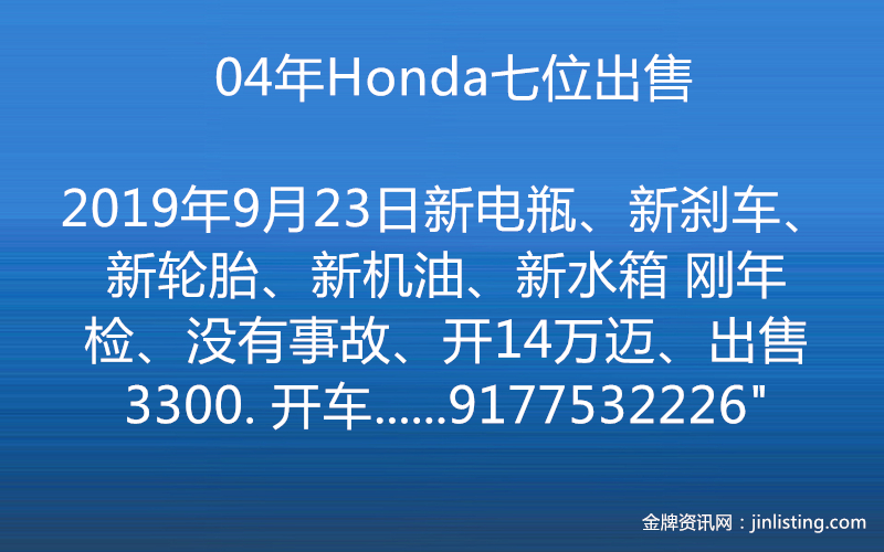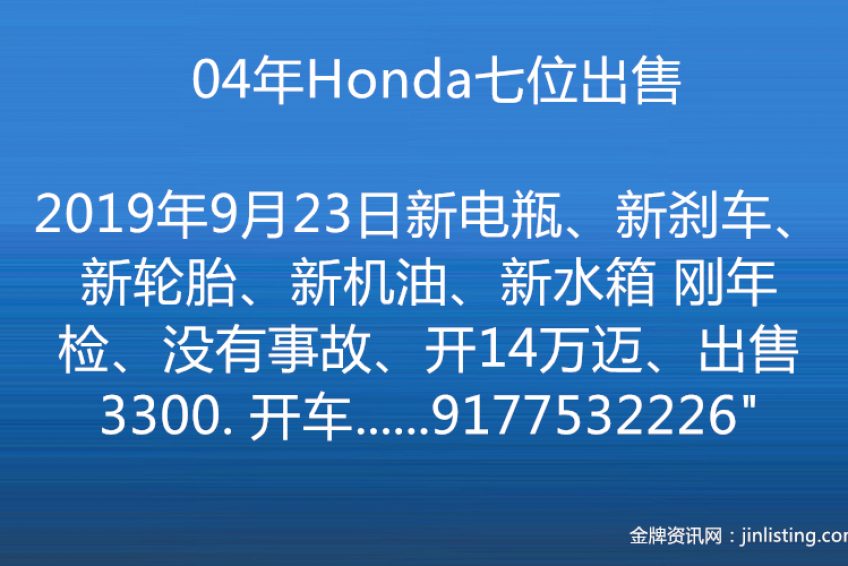 04年Honda七位出售 “新电瓶、新刹车、新轮胎、新机油、新水箱 刚年检、没有事故、开14万迈、出售3300. 开车在法拉盛,联系号码:9177532226”