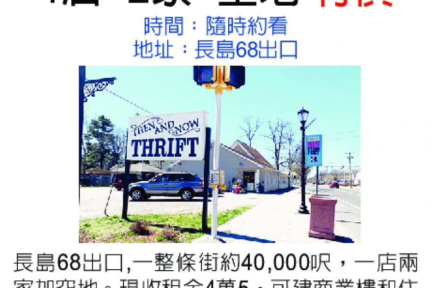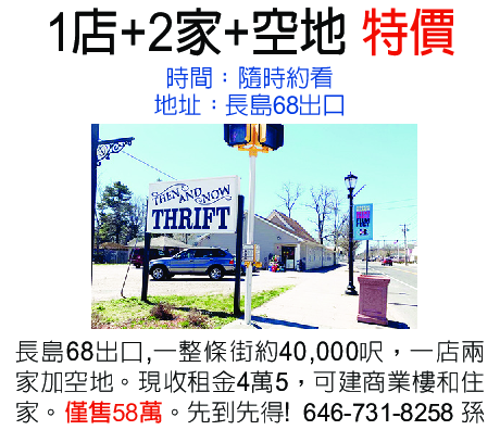 長島68出口,一整條街約40,000呎,有一店兩家加空地。現收租金4萬5,可建商業樓和住家。僅售58萬。先到先得 646-731-8258孫