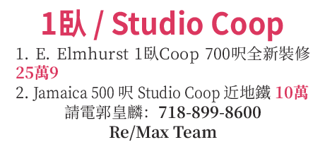 2. Jamaica 500呎Studio Coop近地鐵10萬。請電郭皇麟718-899-8600Re/Max Team