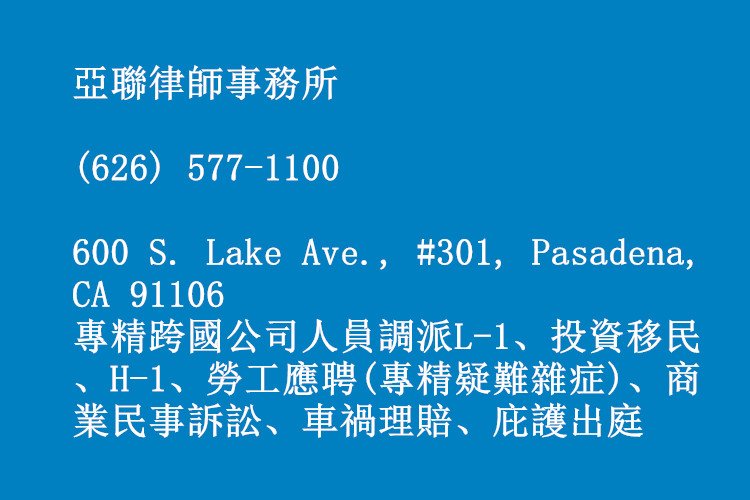 專精跨國公司人員調派L-1、投資移民、H-1、勞工應聘(專精疑難雜症)、商業民事訴訟、車禍理賠、庇護出庭