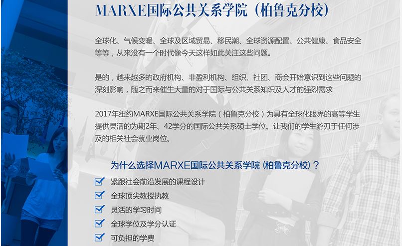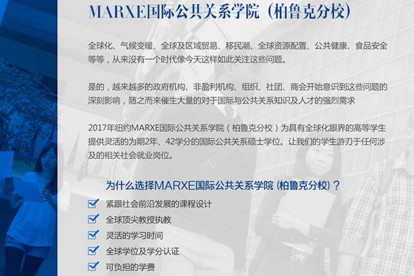 介紹:MARXE國際公共關係學院(柏魯克分校)為具有全球化眼界的高等學生提供為期2年,42學分的國際公共關係碩士學位讓我們的學生游刃於任何涉及的相關社會就業崗位