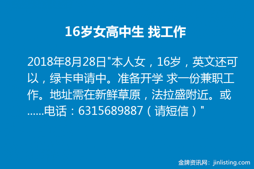 “本人女,16岁,英文还可以,绿卡申请中。准备开学 求一份兼职工作。