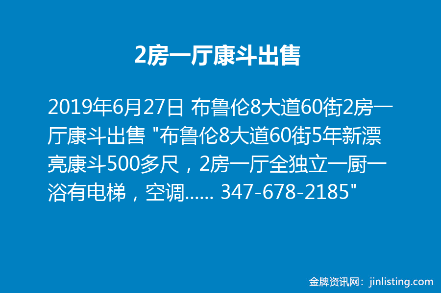 布鲁伦8大道60街2房一厅康斗出售 “布鲁伦8大道60街5年新漂亮康斗500多尺,2房一厅全独立一厨一浴有电梯,空调,多窗,有阳台,还有10多年减地税。 近N车及巴士,购物餐馆十分方便。售$49.9万 。 有兴趣请call潘太: 347-678-2185”