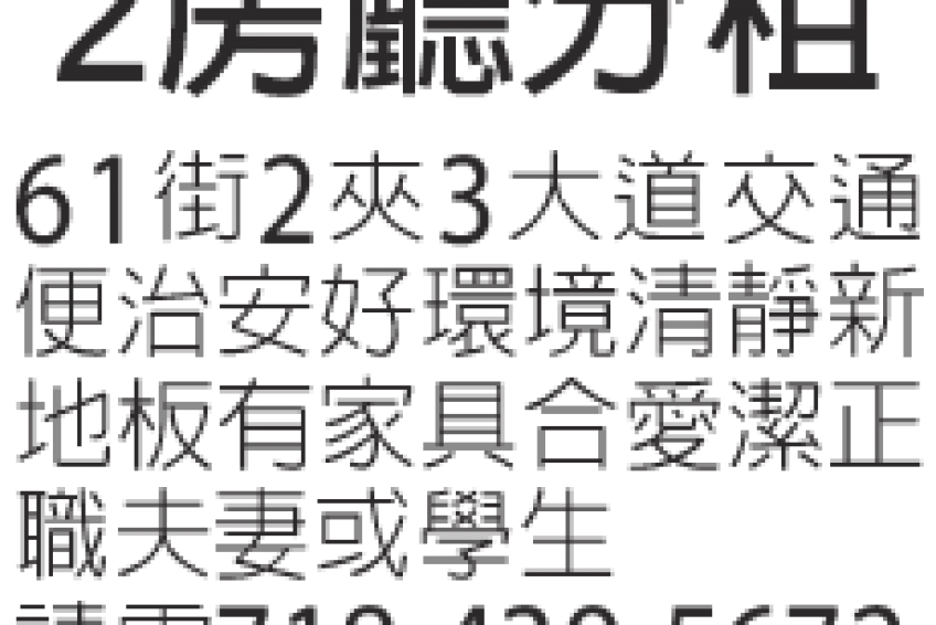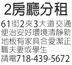 61街2夾3大道交通便治安好環境清靜新地板有家具合愛潔正職夫妻或學生請電718-439-5672