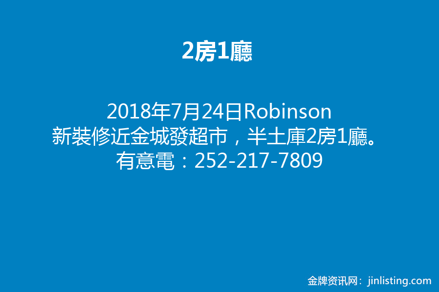 Robinson新裝修近金城發超市,半土庫2房1廳。有意電:252-217-7809
