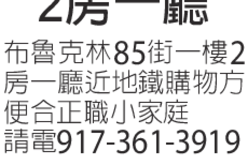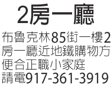 布魯克林85街一樓2房1廳近地鐵購物方便合正職小家庭電917-361-3919