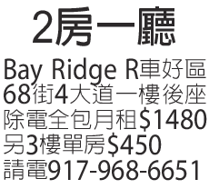 Bay Ridge R車好區68街4大道一樓後座除電外全包月租$1480,另3楼单房$450.請電917-968-6651