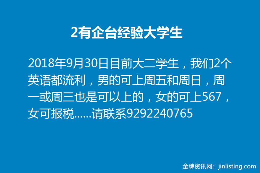 目前大二学生,我们2个英语都流利,男的可上周五和周日,周一或周三也是可以上的,女的可上567,女可报税,我们之前有做过2年企台的经验,如有老板需要,请联系9292240765